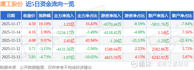 证券之星消息,厦工股份11月17日涨停收盘,收盘价4.58元。该股于9点30分涨停,5次打开涨停,截止收盘封单资金为7037.08万元,占其流通市值0.87%。