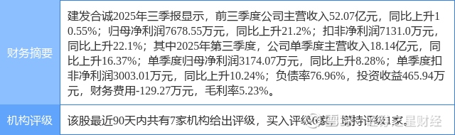 2025年8月20日,开源证券研究员齐东,胡耀文,杜致远发布了对建发合诚的研报《公司信息更新报告:营收利润同比大幅增长,工程施工业务订单大幅增长》,该研报对建发合诚给出“买入”评级。研报中预计2025-2027年归母净利润为1.2、1.5、1.7亿元(原1.1、1.3、1.3亿元),对应2025-2027年EPS为0.5、0.6、0.6元,当前股价对应PE为22.0、17.9、15.8倍。公司凭借与控股股东之间的优势互补,有望推动收入持续增长,维持“买入”评级。证券之星数据中心根据近三年发布的研报数据计算,该研报作者对此股的盈利预测准确度为72.8%。