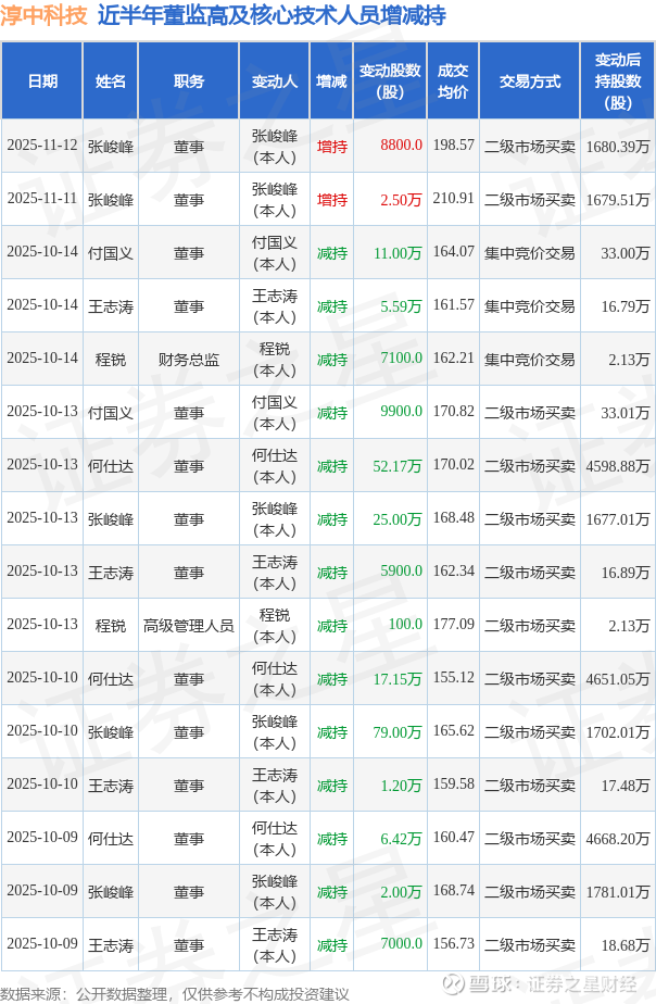 淳中科技近半年内的董监高及核心技术人员增减持详情如下: