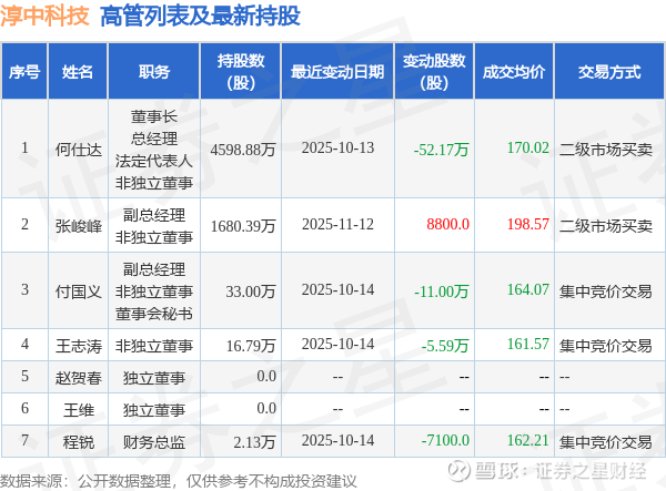 证券之星消息,根据11月17日市场公开信息、上市公司公告及交易所披露数据整理,淳中科技(603516)最新董监高及相关人员股份变动情况:2025年11月11日至2025年11月12日公司董事张峻峰共增持公司股份3.38万股,占公司总股本为0.0166%。变动期间公司股价下跌6.78%,11月12日当日收盘报199.66元。