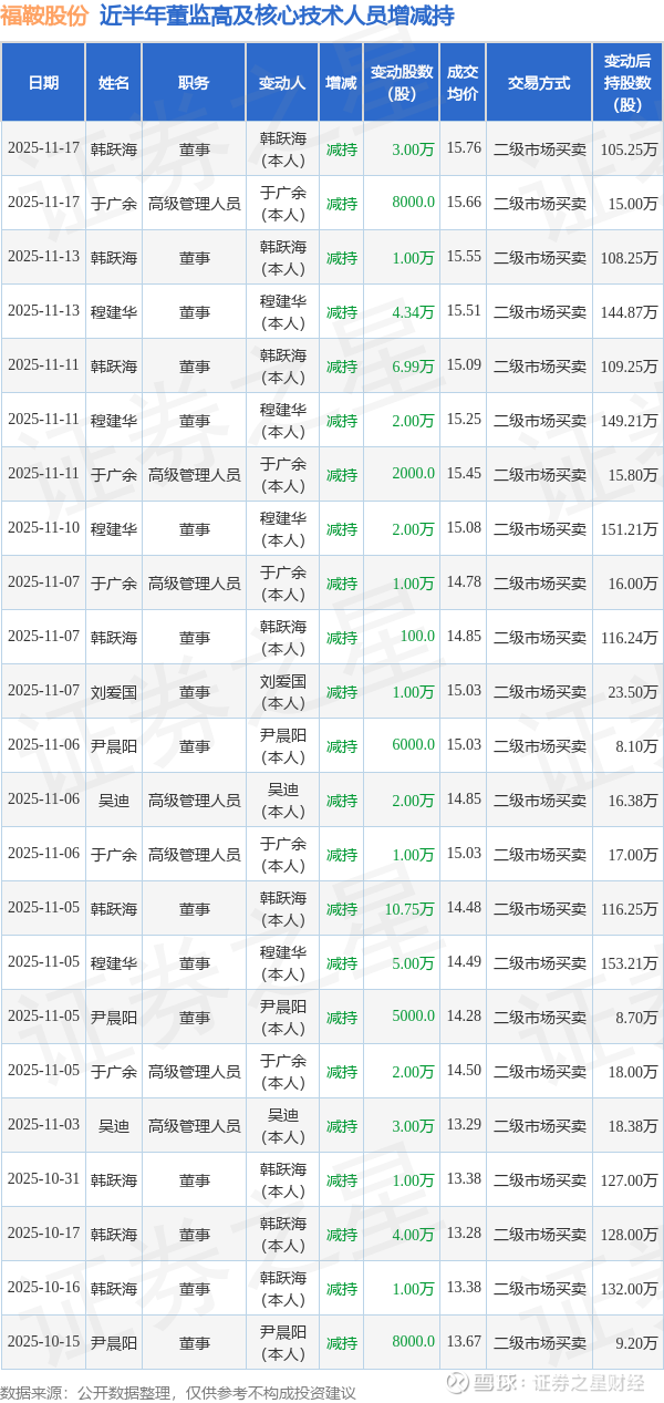 福鞍股份近半年内的董监高及核心技术人员增减持详情如下: