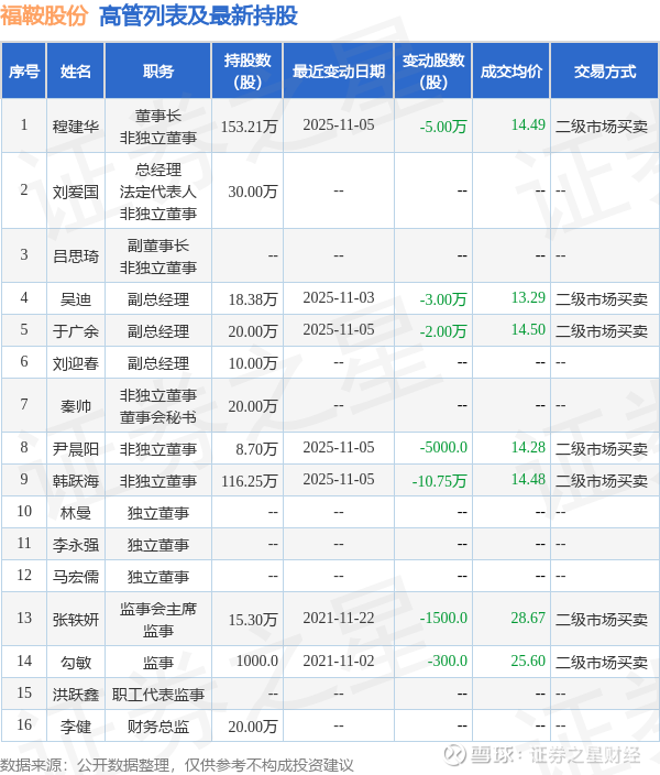 福鞍股份的高管列表及最新持股情况如下: