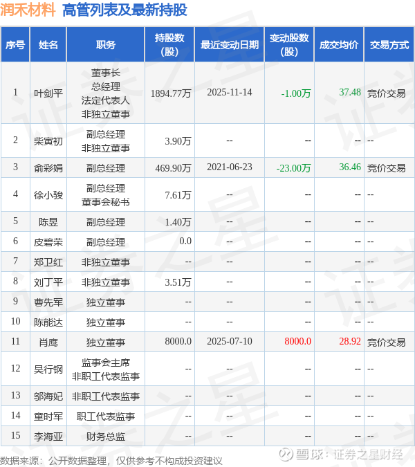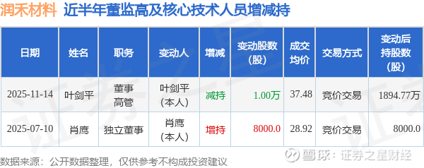 润禾材料近半年内的董监高及核心技术人员增减持详情如下: