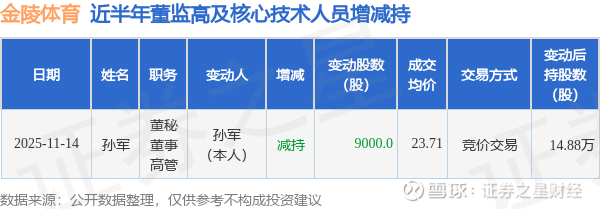 证券之星消息,根据11月17日市场公开信息、上市公司公告及交易所披露数据整理,金陵体育(300651)最新董监高及相关人员股份变动情况:2025年11月14日公司董秘,董事,高管孙军共减持公司股份9000.0股,占公司总股本为0.0064%。变动期间公司股价上涨3.91%,11月14日当日收盘报23.1元。