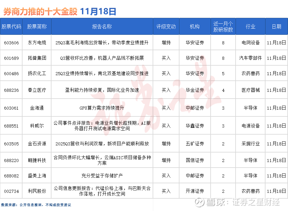 据证券之星数据库不完全统计,11月18日券商共给予超20家A股上市公司“买入”评级。从行业分布看,券商11月18日关注的个股聚焦于电网设备、汽车零部件、农药兽药、医疗器械、半导体、电源设备、采掘、半导体等行业。