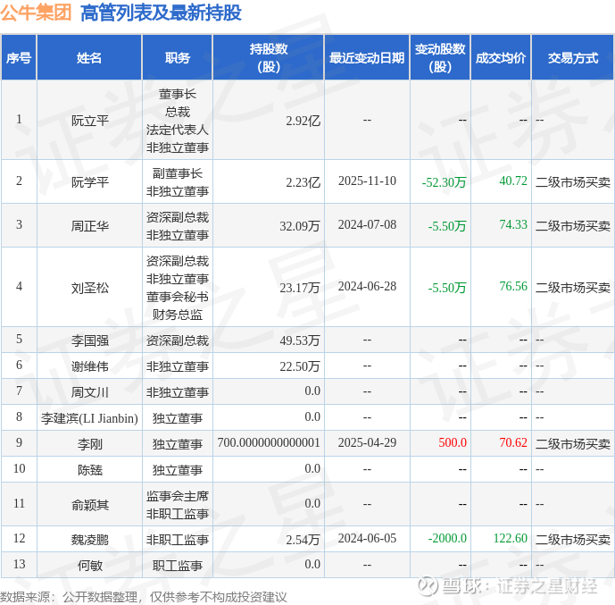 公牛集团的高管列表及最新持股情况如下: