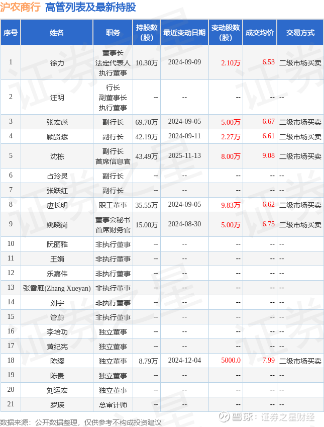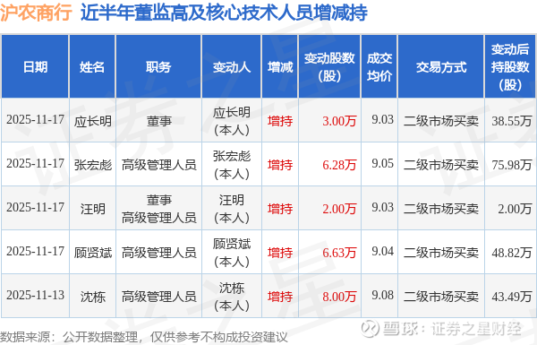 沪农商行近半年内的董监高及核心技术人员增减持详情如下: