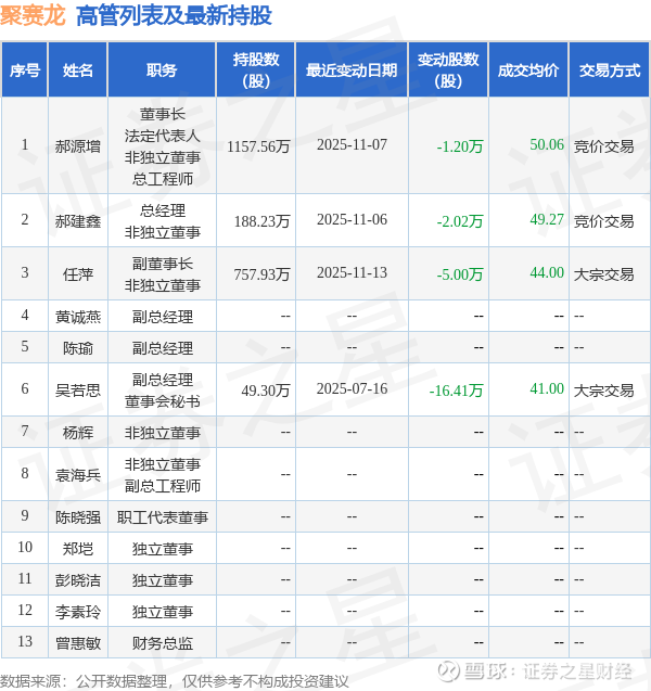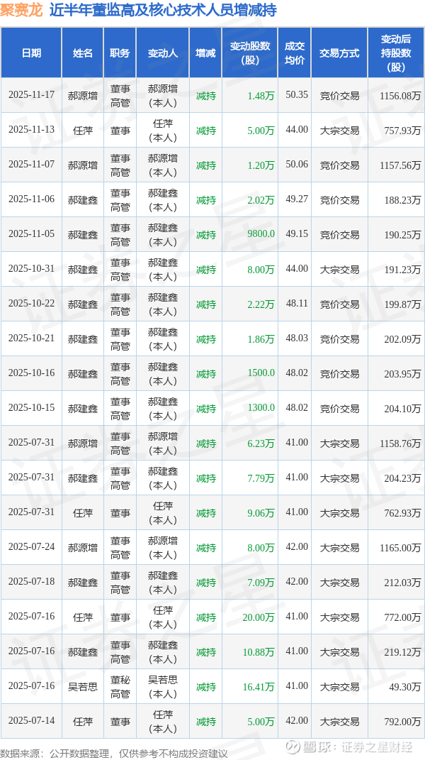 聚赛龙近半年内的董监高及核心技术人员增减持详情如下: