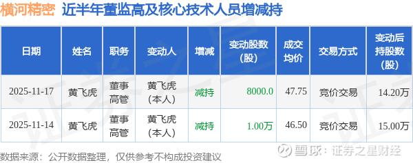 证券之星消息,根据11月18日市场公开信息、上市公司公告及交易所披露数据整理,横河精密(300539)最新董监高及相关人员股份变动情况:2025年11月17日公司董事,高管黄飞虎共减持公司股份8000.0股,占公司总股本为0.003%。变动期间公司股价上涨7.53%,11月17日当日收盘报48.15元。