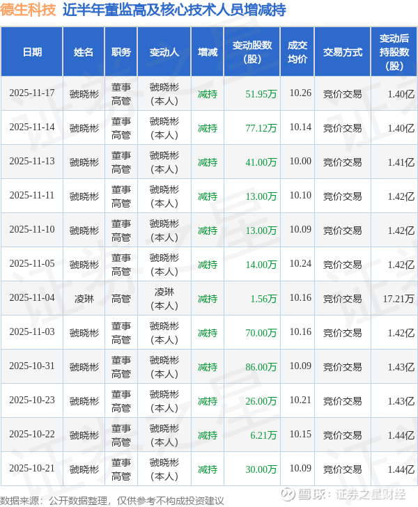 德生科技近半年内的董监高及核心技术人员增减持详情如下: