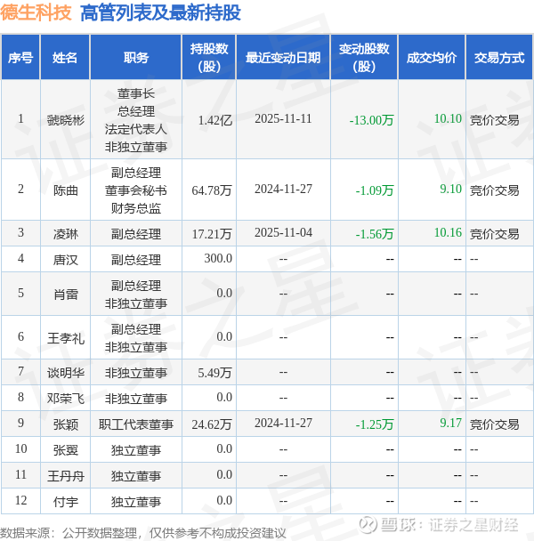 德生科技的高管列表及最新持股情况如下: