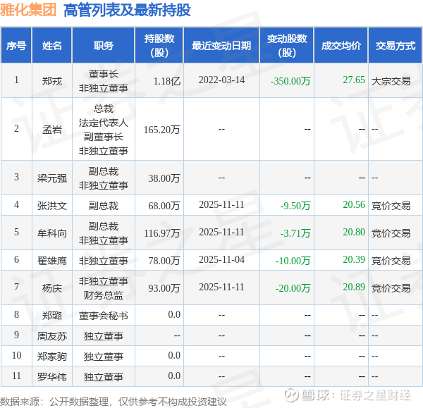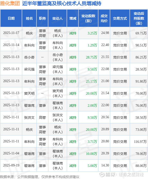 雅化集团近半年内的董监高及核心技术人员增减持详情如下: