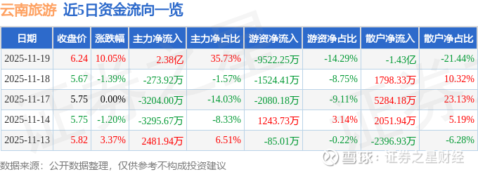 证券之星消息,云南旅游11月19日涨停收盘,收盘价6.24元。该股于13点8分涨停,5次打开涨停,截止收盘封单资金为2851.56万元,占其流通市值0.46%。