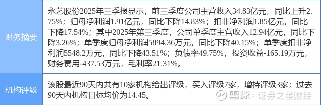 2025年10月28日,华安证券研究员徐偲,余倩莹发布了对永艺股份的研报《25Q3业绩短期承压,积极开拓新市场新客户》,该研报对永艺股份给出“买入”评级。研报中预计公司2025-2027年营收分别为51.56/57.39/62.3亿元,分别同比增长8.6%/11.3%/8.5%;归母净利润分别为3.21/3.84/4.46亿元,分别同比增长8.5%/19.5%/16.1%;EPS分别为0.97/1.16/1.35元,截至2025年10月27日,对应PE分别为11.81/9.88/8.51倍。维持“买入”评级。证券之星数据中心根据近三年发布的研报数据计算,该研报作者对此股的盈利预测准确度为91.02%。