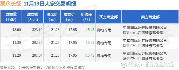 证券之星消息,11月19日泰永长征发生大宗交易,交易数据如下: