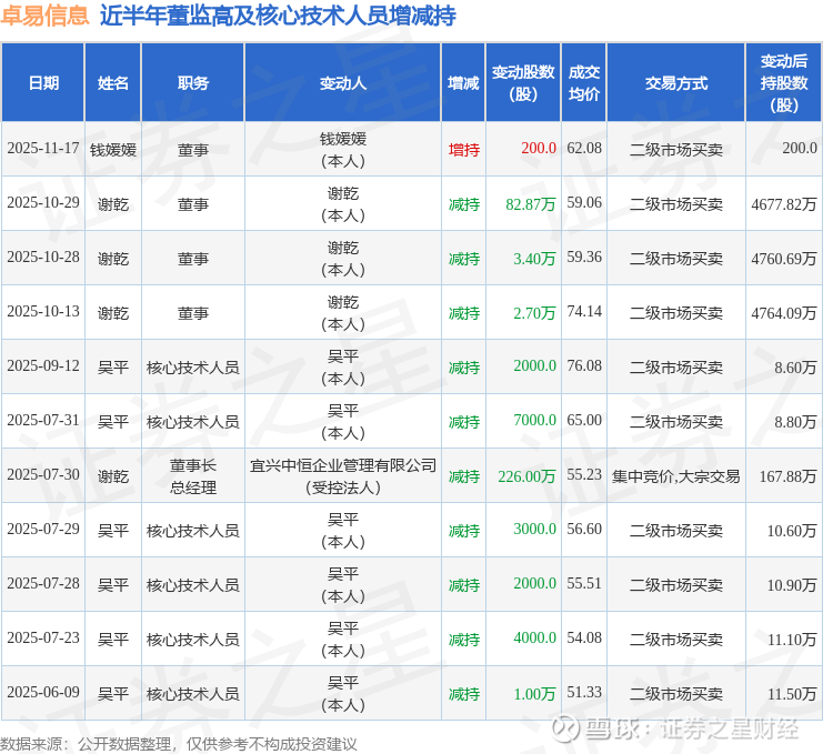 卓易信息近半年内的董监高及核心技术人员增减持详情如下: