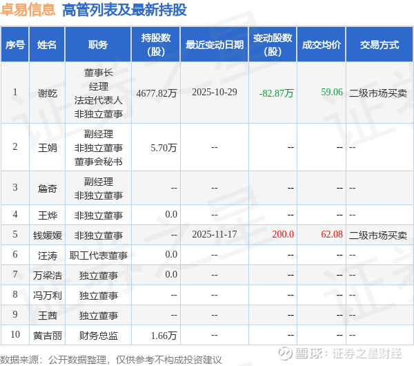 证券之星消息,根据11月19日市场公开信息、上市公司公告及交易所披露数据整理,卓易信息(688258)最新董监高及相关人员股份变动情况:2025年11月17日公司董事钱媛媛共增持公司股份200.0股,占公司总股本为0.0002%。变动期间公司股价上涨2.44%,11月17日当日收盘报62.18元。
