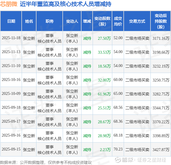 证券之星消息,根据11月19日市场公开信息、上市公司公告及交易所披露数据整理,芯朋微(688508)最新董监高及相关人员股份变动情况:2025年11月18日公司董事,核心技术人员张立新共减持公司股份27.5万股,占公司总股本为0.2094%。变动期间公司股价上涨0.38%,11月18日当日收盘报58.62元。
