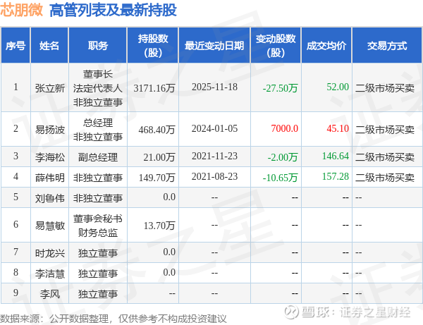 芯朋微的高管列表及最新持股情况如下: