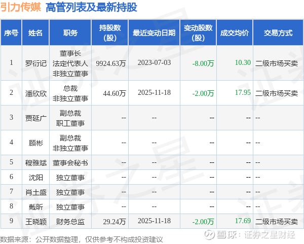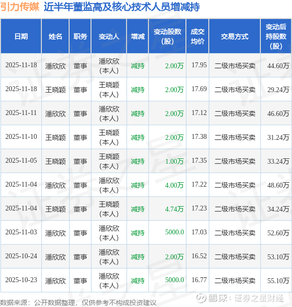 引力传媒近半年内的董监高及核心技术人员增减持详情如下:
