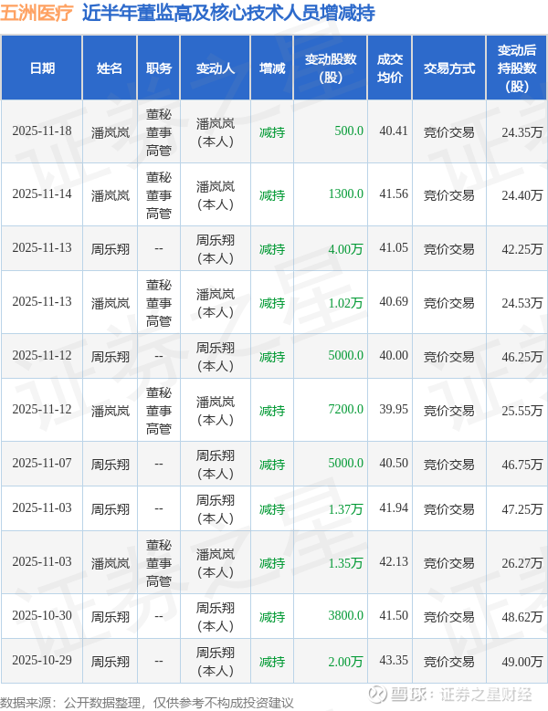 五洲医疗近半年内的董监高及核心技术人员增减持详情如下: