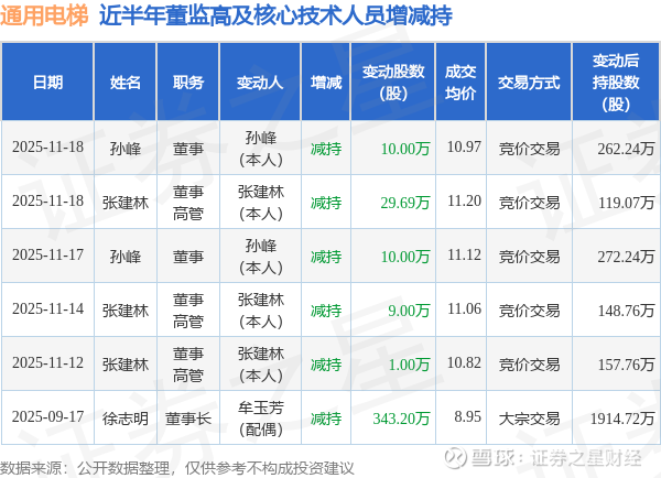 通用电梯近半年内的董监高及核心技术人员增减持详情如下: