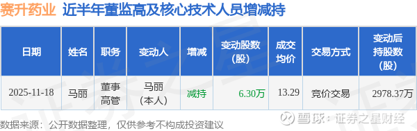 证券之星消息,根据11月19日市场公开信息、上市公司公告及交易所披露数据整理,赛升药业(300485)最新董监高及相关人员股份变动情况:2025年11月18日公司董事,高管马丽共减持公司股份6.3万股,占公司总股本为0.0131%。变动期间公司股价下跌2.94%,11月18日当日收盘报12.86元。