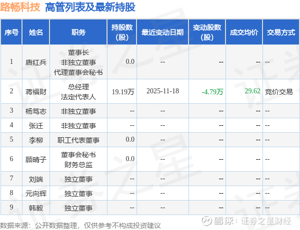 证券之星消息,根据11月19日市场公开信息、上市公司公告及交易所披露数据整理,路畅科技(002813)最新董监高及相关人员股份变动情况:2025年11月18日公司高管蒋福财共减持公司股份4.79万股,占公司总股本为0.0399%。变动期间公司股价上涨9.99%,11月18日当日收盘报29.62元。