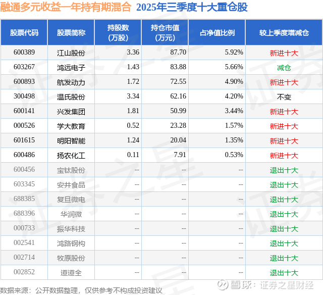 根据2025基金Q3季报公募基金重仓股数据,重仓该股的公募基金共1家,其中持有数量最多的公募基金为融通基金的融通多元收益一年持有期混合。融通多元收益一年持有期混合目前规模为0.15亿元,最新净值0.9931(11月19日),较上一交易日下跌0.13%,近一年上涨1.34%。该公募基金现任基金经理为樊鑫 石础 李皓。石础在任的基金产品包括:融通通乾研究精选灵活配置混合A,管理时间为2024年9月30日至今,期间收益率为12.98%;樊鑫在任的基金产品包括:融通稳健增利6个月持有混合A,管理时间为2023年3月6日至今,期间收益率为-0.15%;融通增辉定开债券发起式,管理时间为2023年6月6日至今,期间收益率为9.07%;融通通福债券(LOF)A,管理时间为2023年6月6日至今,期间收益率为7.32%;融通可转债债券A,管理时间为2023年8月5日至今,期间收益率为-13.35%。李皓在任的基金产品包括:融通通裕定开债,管理时间为2024年1月4日至今,期间收益率为6.55%;融通通祺债券A,管理时间为2024年1月4日至今,期间收益率为6.29%;融通增悦债券,管理时间为2024年4月24日至今,期间收益率为3.6%;融通通润债券,管理时间为2024年9月30日至今,期间收益率为2.24%。