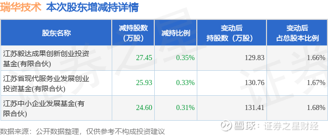 证券之星消息,11月20日瑞华技术发布公告《瑞华技术:简式权益变动报告书》,其股东江苏毅达成果创新创业投资基金(有限合伙)、江苏省现代服务业发展创业投资基金(有限合伙)、江苏中小企业发展基金(有限合伙)于2025年7月26日至2025年11月20日间合计减持77.98万股,占公司目前总股本的0.9947%,变动期间该股股价下跌7.95%,截止11月20日收盘报31.59元。