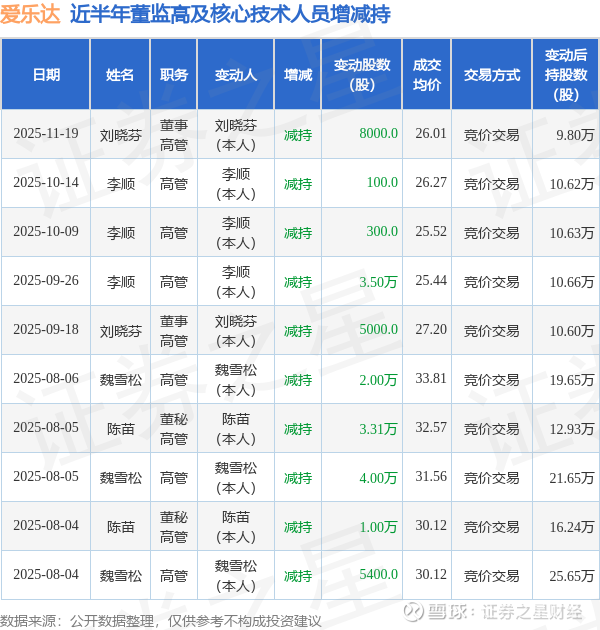 爱乐达近半年内的董监高及核心技术人员增减持详情如下: