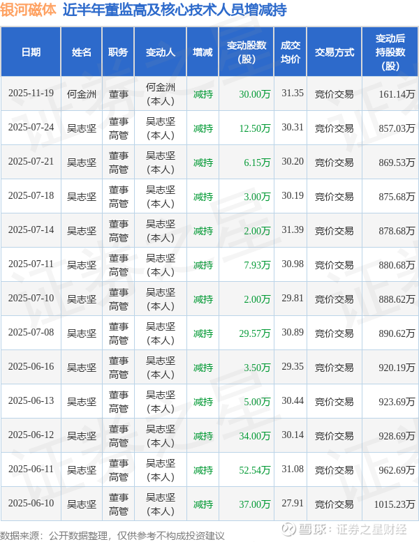银河磁体近半年内的董监高及核心技术人员增减持详情如下: