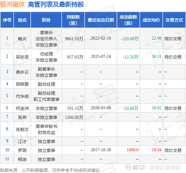 银河磁体的高管列表及最新持股情况如下: