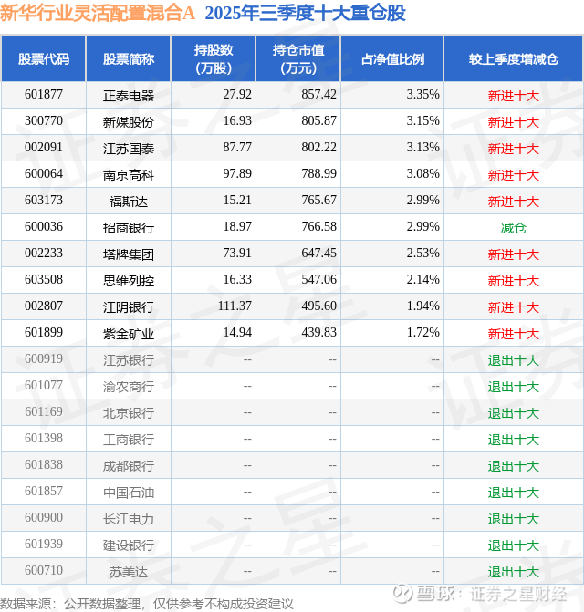 新华行业灵活配置混合A的前十大重仓股如下: