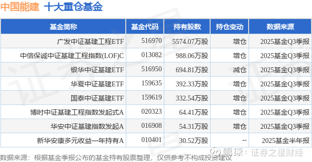 根据2025基金Q3季报公募基金重仓股数据,重仓该股的公募基金共7家,其中持有数量最多的公募基金为广发基金的广发中证基建工程ETF。广发中证基建工程ETF目前规模为26.12亿元,最新净值1.1719(11月20日),较上一交易日下跌0.06%,近一年下跌0.31%。该公募基金现任基金经理为霍华明。霍华明在任的基金产品包括:广发信息技术联接A,管理时间为2017年4月20日至今,期间收益率为53.69%;广发医药卫生联接A,管理时间为2017年4月20日至今,期间收益率为5.42%;广发中证全指医药卫生ETF,管理时间为2017年4月20日至今,期间收益率为5.61%;广发中证全指信息技术ETF,管理时间为2017年4月20日至今,期间收益率为59.07%。