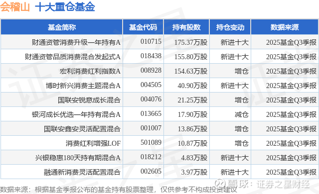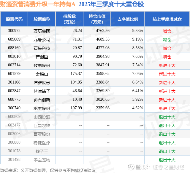 根据2025基金Q3季报公募基金重仓股数据,重仓该股的公募基金共10家,其中持有数量最多的公募基金为财通资管的财通资管消费升级一年持有A。财通资管消费升级一年持有A目前规模为4.84亿元,最新净值0.825(11月20日),较上一交易日下跌1.59%,近一年上涨15.59%。该公募基金现任基金经理为于洋 林伟。于洋在任的基金产品包括:财通资管消费精选混合A,管理时间为2018年9月14日至今,期间收益率为124.86%;林伟在任的基金产品包括:财通资管品质消费混合发起式A,管理时间为2023年5月11日至今,期间收益率为32.7%;