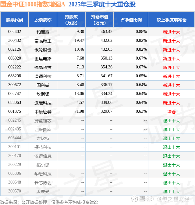 国金中证1000指数增强A的前十大重仓股如下: