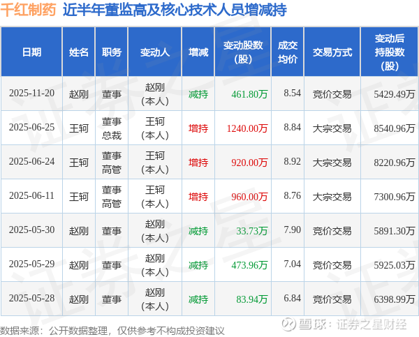 证券之星消息,根据11月21日市场公开信息、上市公司公告及交易所披露数据整理,千红制药(002550)最新董监高及相关人员股份变动情况:2025年11月20日公司董事赵刚共减持公司股份461.8万股,占公司总股本为0.3608%。变动期间公司股价下跌0.12%,11月20日当日收盘报8.53元。