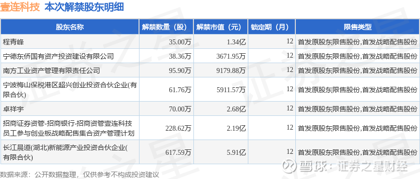 证券之星消息,根据市场公开信息整理,壹连科技(301631)于11月24日将有1147.23万股限售股份解禁,为公司首发原股东限售股份,首发战略配售股份,占公司总股本12.55%。(本次数据根据历史公告整理得出,实际情况以上市公司最新公告为准)最近一年内,该股累计解禁70.97万股,占总股本的0.78%。本次解禁后,公司还有6070.91万股限售股份,占总股本66.41%。具体如下图所示: