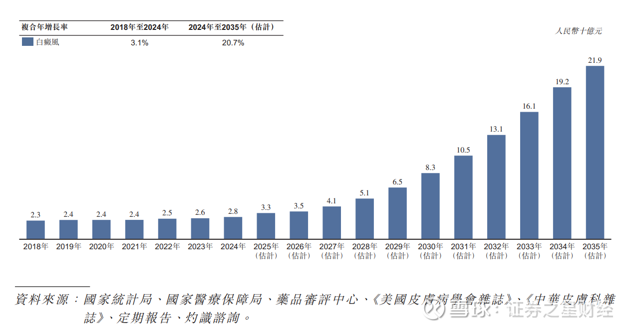 作为国内尚无获批治疗药物的“刚需领域”,白癜风行业潜力尤为突出。研究显示,白色斑块的明显存在可能会让患者认为自身的形象受到损害,进而影响其自信心。因此,患者对于容貌改善的临床需求也更为突出。根据灼识咨询报告,国内白癜风治疗药物市场规模预计将从2024年的28亿元增长至2035年约219亿元,复合年增长率估计高达20.7%。
