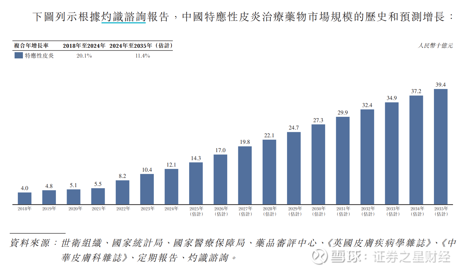 被称为皮肤科的“一号疾病”的特应性皮炎,是一种常见的慢性、复发性、炎症性皮肤病,患者群体庞大。根据灼识咨询报告,2024年,特应性皮炎影响中国超过5,400万人,其中轻度、中度和重度特应性皮炎的占比分别为73%、25%和2%;2024年中国特应性皮炎治疗药物市场规模为人民币121亿元,预计到2035年该药物市场规模将增长至394亿元。