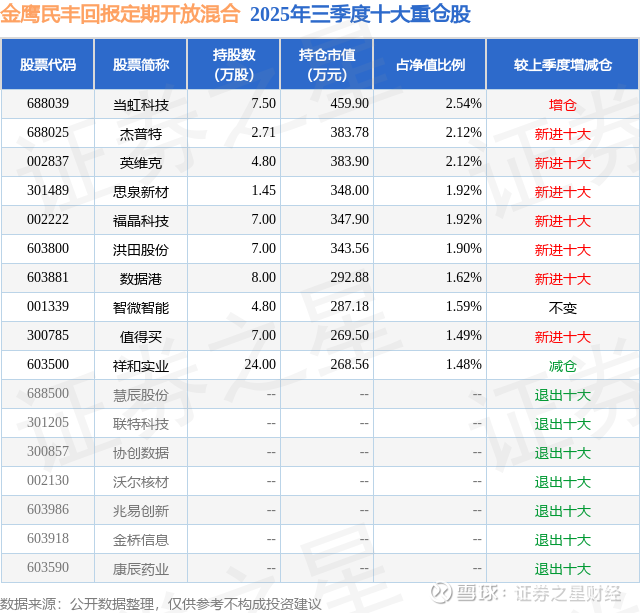 根据2025基金Q3季报公募基金重仓股数据,重仓该股的公募基金共1家,其中持有数量最多的公募基金为金鹰基金的金鹰民丰回报定期开放混合。金鹰民丰回报定期开放混合目前规模为1.81亿元,最新净值1.0904(11月21日),较上一交易日下跌2.87%,近一年上涨17.4%。该公募基金现任基金经理为林龙军。林龙军在任的基金产品包括:金鹰鑫益混合A,管理时间为2018年5月17日至今,期间收益率为35.79%;金鹰持久增利债券(LOF)C,管理时间为2018年5月17日至今,期间收益率为49.97%;金鹰元丰债券A,管理时间为2018年5月17日至今,期间收益率为64.17%;金鹰元祺债券A,管理时间为2018年6月2日至今,期间收益率为57.28%。