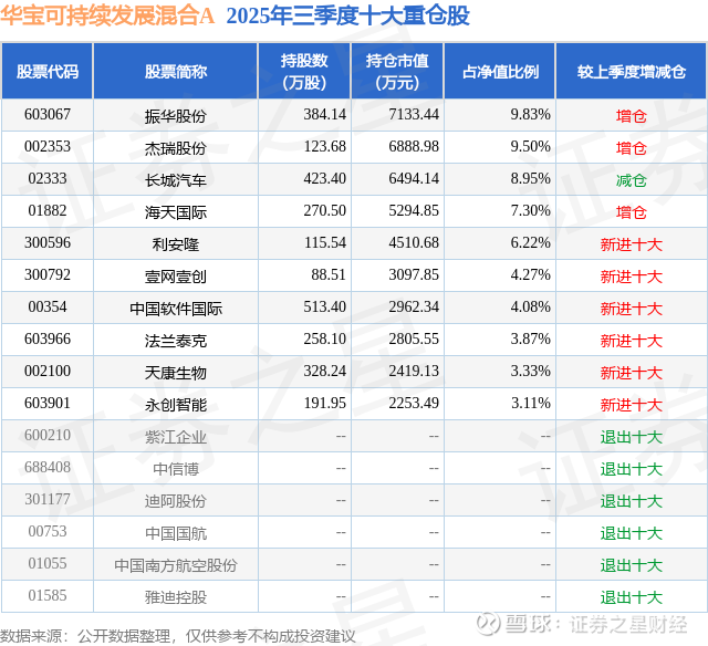 华宝可持续发展混合A的前十大重仓股如下: