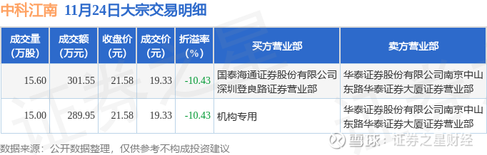 证券之星消息,11月24日中科江南发生大宗交易,交易数据如下: