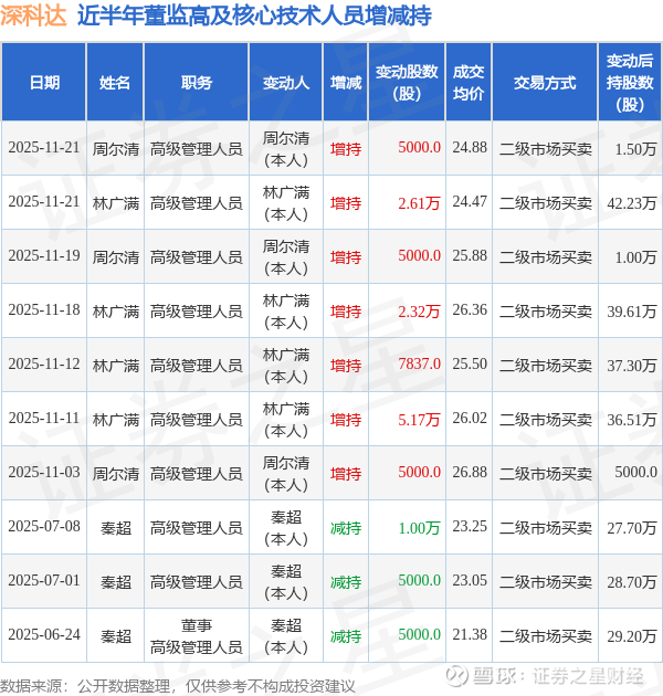 深科达近半年内的董监高及核心技术人员增减持详情如下: