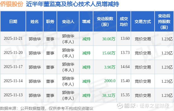 侨银股份近半年内的董监高及核心技术人员增减持详情如下: