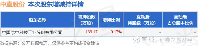 证券之星消息,11月24日中直股份发布公告《中直股份:中航直升机股份有限公司关于公司控股股东增持股份结果公告》,其股东中国航空科技工业股份有限公司于2025年11月24日合计增持139.17万股,占公司目前总股本的0.1697%,变动期间该股股价上涨0.76%,截止11月24日收盘报35.82元。