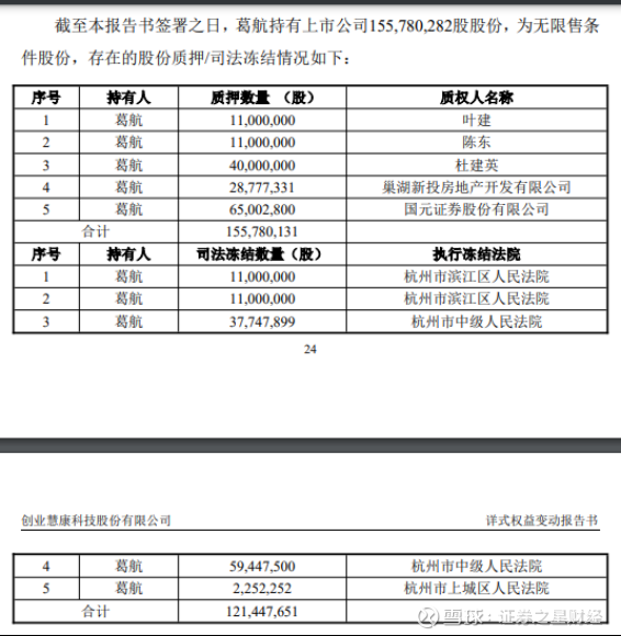 创业慧康的公告显示,葛航协议转让及表决权委托系个人原因。分析指出,葛航作为创业慧康第一大股东和创始人,此举或为了解决债务问题。公开信息显示,目前葛航所持创业慧康的全部股份全部处于质押状态,且1.21亿股被司法冻结。
