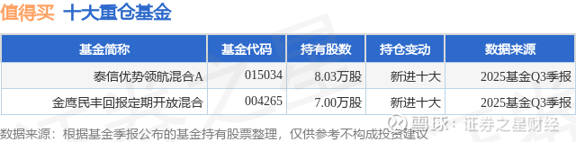 根据2025基金Q3季报公募基金重仓股数据,重仓该股的公募基金共2家,其中持有数量最多的公募基金为泰信基金的泰信优势领航混合A。泰信优势领航混合A目前规模为0.18亿元,最新净值1.0512(11月24日),较上一交易日上涨5.06%,近一年上涨25.17%。该公募基金现任基金经理为吴秉韬。吴秉韬在任的基金产品包括:泰信国策驱动灵活配置混合,管理时间为2019年7月25日至今,期间收益率为169.49%;泰信优质生活混合,管理时间为2021年10月12日至今,期间收益率为-37.3%;泰信低碳经济混合发起式A,管理时间为2021年11月3日至今,期间收益率为-12.82%;