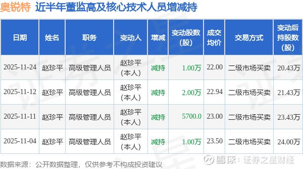 奥锐特近半年内的董监高及核心技术人员增减持详情如下: